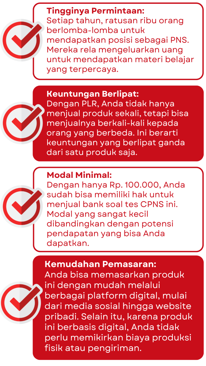 Dengan produk PLR ini, Anda siap meraih keuntungan besar dari persiapan tes CPNS 2024 yang sangat diminati banyak orang.